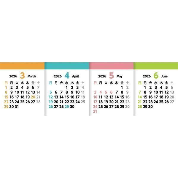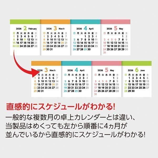 【1色印刷費用込み】クリニック、旅行関係、不動産関係の受付カウンターや、各種士業の方々にお使いいただくことを想定した、4ヶ月タイプの卓上カレンダーです。表側は当月を含めた4ヶ月を同じレイアウトで掲載。裏側は、当月のみのカレンダーとなっており、スケジュールを書き込むこともできます。既存の複数月掲載タイプの商品とは異なり、13枚構成を採用。1枚めくると翌月が一番左に来る仕様ですので、常に直感的な日程確認が可能です。お客様や患者さまと日程を打ち合わせる際に、特に便利にお使いいただけるカレンダーです。【本体サイズ】:H85×W216mm 【素材】:マットコート〈135〉【色・柄・種類】:【個装形態】:OPP袋付き(添付)【パッケージサイズ】:H135×230×320mm【名入れ可能サイズ】:H12×W170mm以内【備考】:表紙・本文4/2 13枚【最小ご注文数量】:75個以上1個単位