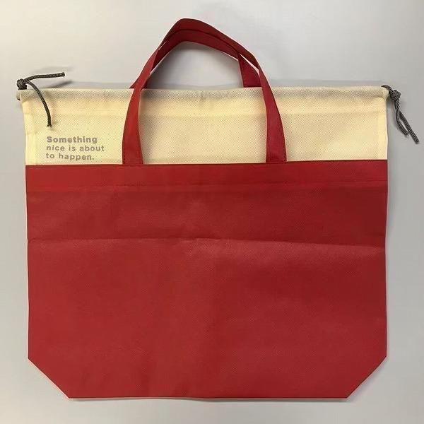 バッグの口がしぼれるようになっているのがポイント。中の物を落とさないよう、しっかり守ります。【本体サイズ】:38×43×マチ10cm【素材】:ポリプロピレン【色・柄・種類】:3色アソート※色・柄はご指定いただけません。【個装形態】:裸【パッケージサイズ】:【名入れ可能サイズ】:【備考】:【最小ご注文数量】:240個以上240個単位