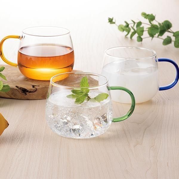 コロンとかわいいカタチ、持ち手のカラーがアクセント。オールシーズン活躍してくれるマグカップです。【本体サイズ】:約口径7.5×7cm(満水容量約400ml)【素材】:ホウケイ酸ガラス【色・柄・種類】:3色均等アソート※色・柄はご指定いただけません。【個装形態】:箱【パッケージサイズ】:10.5×8×10.5cm【名入れ可能サイズ】:【備考】:耐熱温度差:120℃、電子レンジ可、熱湯可【最小ご注文数量】:27個以上3個単位