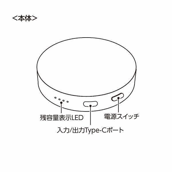直径5cmのころんとした円形フォルムがポイントです。側面には残量表示LEDライトがついていて残量確認も簡単です。【本体サイズ】:Φ7×17(mm)【素材】:ABS 他【色・柄・種類】:【個装形態】:エアパッキン、紙箱【パッケージサイズ】:73×80×25mm【名入れ可能サイズ】:シルク:W50×H50(mm)インクジェット:W50×H50(mm)【備考】:PSE Type-C対応 取説付、残量表示ランプ付【最小ご注文数量】:9個以上1個単位