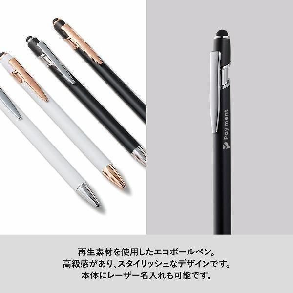 再生素材を使用している高級感のあるスタイリッシュな金属ボールペン。上部にはタッチペンがついておりタブレット操作も可能!