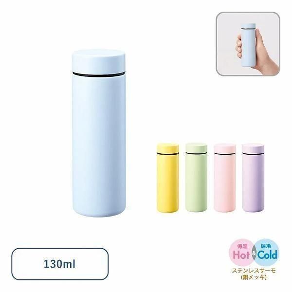 お散歩や通勤時など、比較的短い時間でも少しだけ喉の渇きを感じることありますよね?そんな時にぴったりな130mlサイズです。【本体サイズ】:φ46×137(mm)【素材】:ステンレス(18-8) 他【色・柄・種類】:【個装形態】:PE袋、紙箱【パッケージサイズ】:個装箱 50×50×140mm【名入れ可能サイズ】:回転シルク:B/W130×H98(mm) パッド:A/φ30(mm)、B/W30×H30(mm) インクジェット:A/φ30(mm) 回転インクジェット:C/W144×H109(mm)【備考】:H&Cステンレスサーモ(銅メッキ) 取説付(紙箱面)【最小ご注文数量】:12個以上1個単位