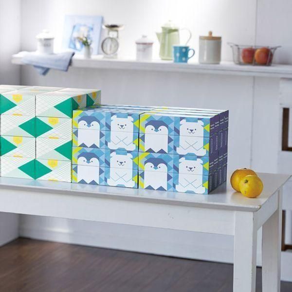 食品の冷凍冷蔵などに役立つフリーザーバッグ。置き場所に合わせて2種の開け方ができ、箱を積み上げるとペンギンとシロクマが座ります!