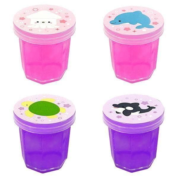 海の生き物のイラストが描かれた容器に入った、手のひらサイズのカラフルなスライムです。カニやタコなど全12種類。