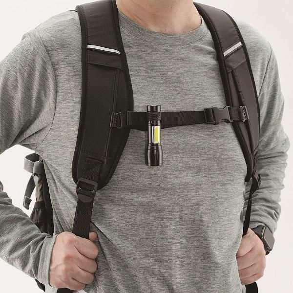 用途に合わせて正面と側面の発光箇所をボタンで切り替え。先端を前後させることで集光⇔拡散と照射範囲を調整できます。災害時の移動にも。クリップ付きなのでバッグなどのベルトにつけて光らせながら移動できます。