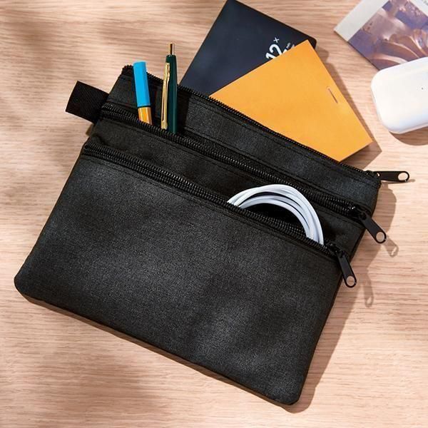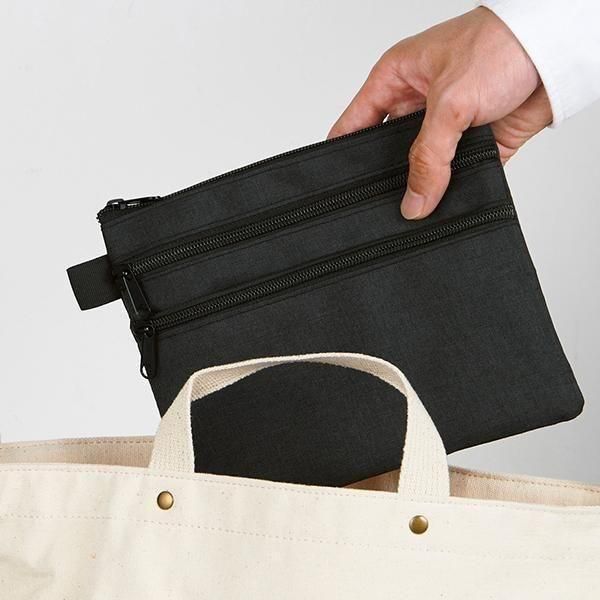 ごちゃつきがちなモバイル周辺機器や文具を3つのポケットに整理して持ち運べます。シンプルな構造なので用途はアイデア次第です。