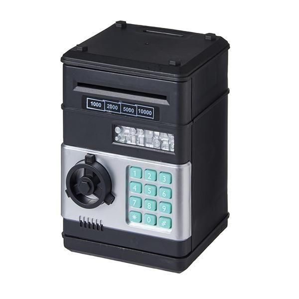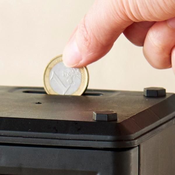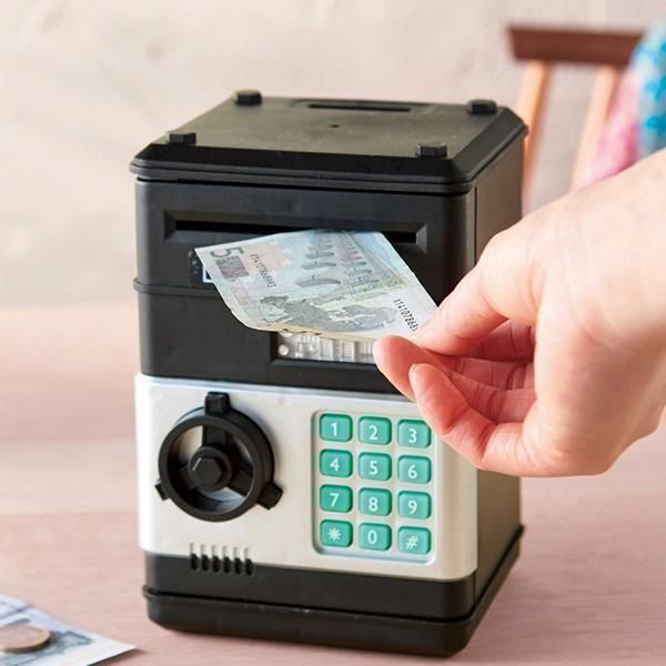 紙幣を挿入すると音楽が流れて中に吸い込まれていく、お子様も使うのが楽しくなる音声機能搭載の電子貯金箱です。もちろん硬貨も貯金可能。