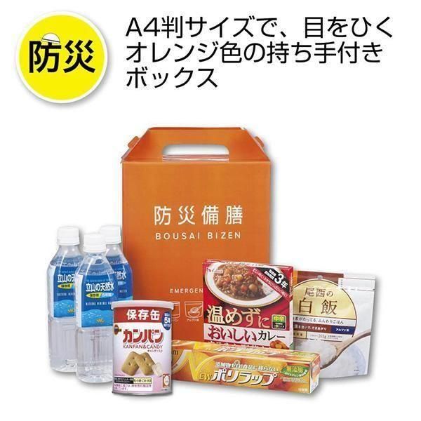 生命維持に欠かせない飲料水をはじめ、長期保存の乾パンや大人も子供も大好きなカレー、避難生活の様々な場面で役立つラップをセットしました。【本体サイズ】:【素材】:【色・柄・種類】:【個装形態】:持ち手付化粧箱入り【パッケージサイズ】:21×11×29.5cm【名入れ可能サイズ】:【備考】:<セット内容> マルサン立山の天然水5年保存500ml×3 尾西のアルファ米 白飯5年保存×1 ブルボン カンパン5年保存×1 ハウス食品 温めずに美味しいカレー(まろやか野菜)×1 ポリラップ(22cm×20m)×1 1,080日間(常温) 【最小ご注文数量】:6個以上6個単位