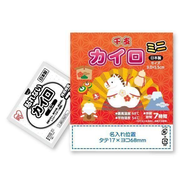 干支柄パッケージ入りの使い捨てカイロミニサイズです。安心のアイリス製(日本製)。【本体サイズ】:【素材】:【色・柄・種類】:【個装形態】:OPP袋入【パッケージサイズ】:130×108×5mm【名入れ可能サイズ】:17×68mm【備考】:内容/カイロミニサイズ×1個 【最小ご注文数量】:480個以上480個単位