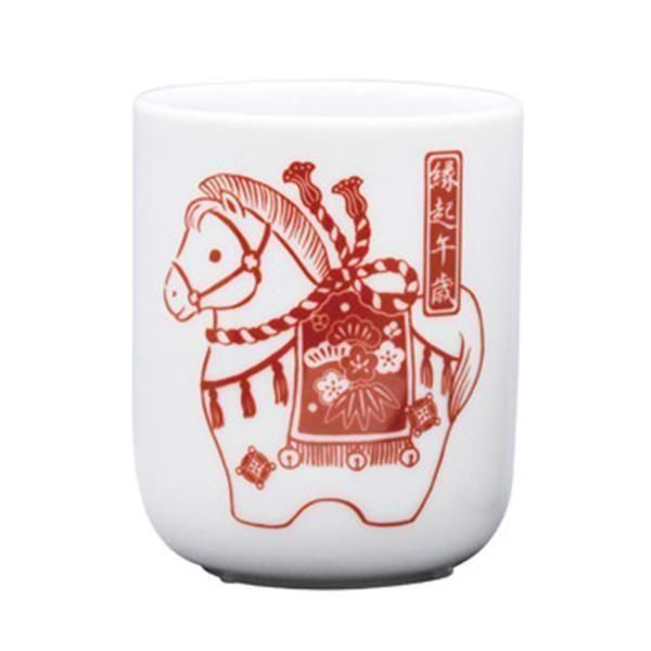 うまくいく1年でありますように。干支「午」がデザインされ縁起の良い湯呑です。日常でも使用できる湯呑は大変喜ばれる商品です。【本体サイズ】:φ60×75mm【素材】:陶器【色・柄・種類】:青・赤 2色均等アソート※色・柄はご指定いただけません。【個装形態】:化粧箱【パッケージサイズ】:77×63×63mm【名入れ可能サイズ】:【備考】:容量/約190ml【最小ご注文数量】:35個以上1個単位