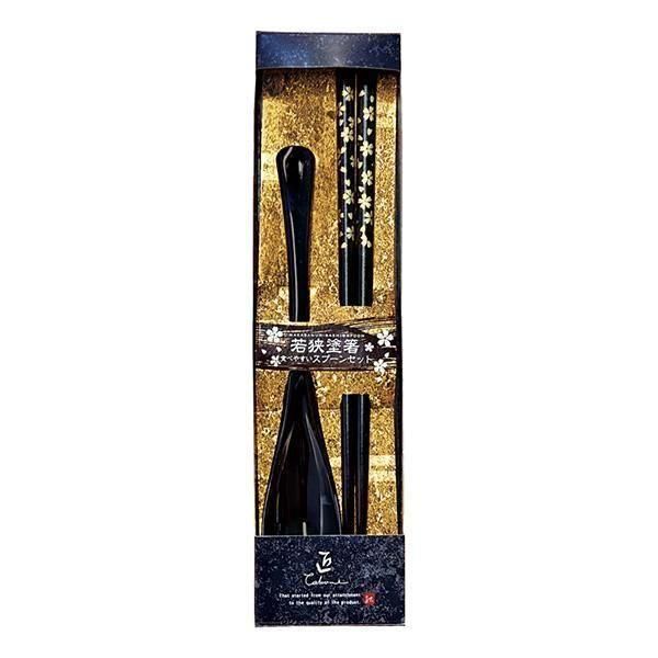 華やかな台紙が特別感を演出。艶が美しい若狭塗と上品な花模様、形状にもこだわった日本製カトラリー。【本体サイズ】:箸:全長230mm スプーン:全長195mm【素材】:箸:天然木 スプーン:アクリル樹脂【色・柄・種類】:黒【個装形態】:化粧箱入(240×60×15mm)【パッケージサイズ】:【名入れ可能サイズ】:【備考】:セット内容:箸・スプーン×各1 日本製【最小ご注文数量】:25個以上1個単位