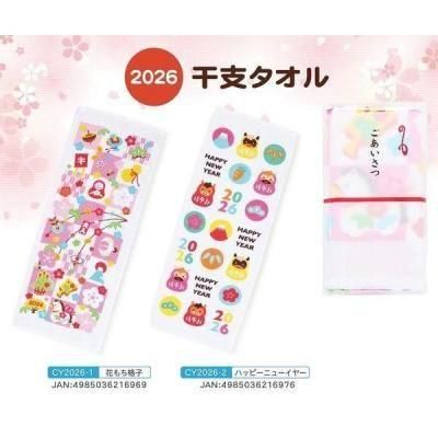 ごあいさつ の袋に入った2026年の干支タオル。粗品や景品にすぐに使えます。【本体サイズ】:340×860mm、180匁【素材】:綿【色・柄・種類】:【個装形態】:【パッケージサイズ】:【名入れ可能サイズ】:【備考】:【12月中旬入荷予定】【最小ご注文数量】:63個以上1個単位