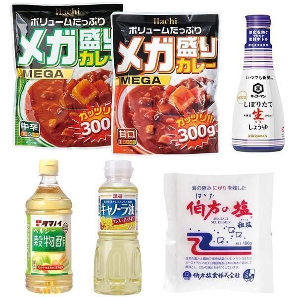 「メーカー商品を注文したいけれどロットが多くて置き場所に困る…」「複数のメーカー商品を小ロットでイベント等に使いたい…」 そんな時にご利用ください! バラで来場記念品として・まとめて抽選会の特賞や成約記念品としてもご利用いただけます。【本体サイズ】:【素材】:【色・柄・種類】:【個装形態】:【パッケージサイズ】:【名入れ可能サイズ】:【備考】:<セット内容> キッコーマン しぼりたて生しょうゆ200ml×5 理研 キャノーラ油265g×5 伯方塩業 伯方の塩100g×5 タマノイ ヘルシー穀物酢500ml×5 ハチ食品 メガ盛りカレー300g甘口×5 ハチ食品 メガ盛りカレー300g中辛×5●賞味期限/365日間(常温)【最小ご注文数量】:2個以上1個単位