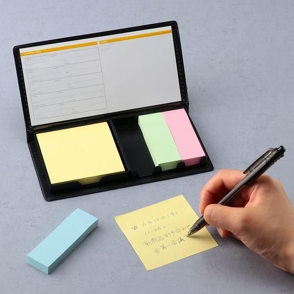 高級感のあるレザー調のメモ&ふせんのセットです【本体サイズ】:175×90×20mm【素材】:紙、PVC【色・柄・種類】:【個装形態】:化粧箱【パッケージサイズ】:W95×H180×D20mm【名入れ可能サイズ】:40×60mm【備考】:セット内容 /アドレスシート×1、付箋76×76mm黄色75枚、付箋25×76mm桃・薄緑・水色各75枚【最小ご注文数量】:87個以上1個単位