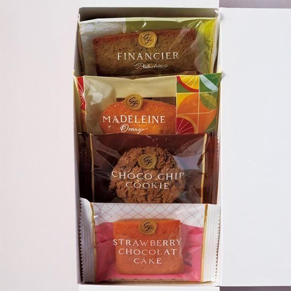 しっとりとした伝統の焼き菓子を詰め合わせ。ティータイムや贈り物におすすめです。【本体サイズ】:セット内容量/4個(ストロベリーショコラケーキ、オレンジマドレーヌ、ピスタチオフィナンシェ、チョコチップクッキー)【素材】:賞味期限:製造日より120日【色・柄・種類】:【個装形態】:箱【パッケージサイズ】:10.7×5×21.2cm【名入れ可能サイズ】:【備考】:【最小ご注文数量】:24個以上12個単位
