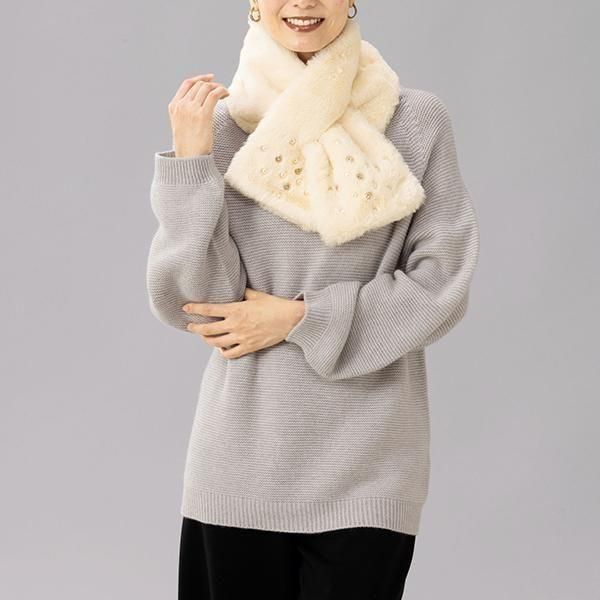 ビジューの輝きが華やか!肌触りよく、ボリュームのある暖かいファーマフラー。