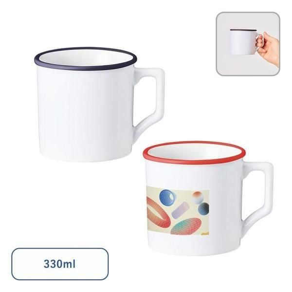 口元をふっくらとさせた優しげなデザインのマグカップです。側面に昇華転写のフルカラー印刷が可能な陶器製。口元の差し色がポイントで、色違いで揃えるのもおすすめです。【本体サイズ】:約Φ90×86(mm)【素材】:ストーンウェア【色・柄・種類】:【個装形態】:紙箱【パッケージサイズ】:W110xH90xD90mm【名入れ可能サイズ】:パッド:W30×H40(mm) 昇華:/W188×H43(mm)【備考】:【最小ご注文数量】:18個以上1個単位