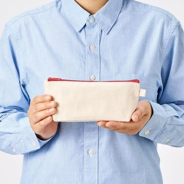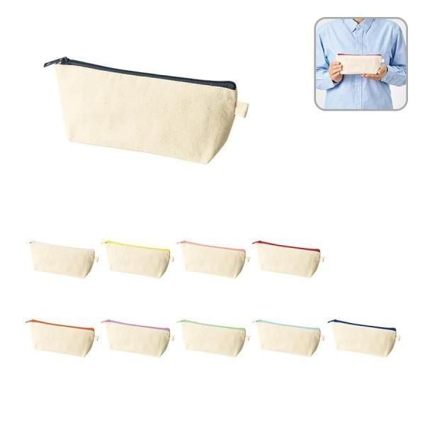 シンプルなナチュラルカラーのボディに10色の中から選べるカラフルなファスナーの舟形ポーチです。横長のロングタイプなのでペンケースにぴったり!サイドのループにキーホルダーやチャームをつけることもできます。