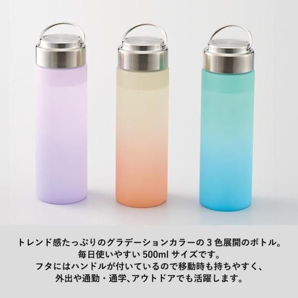 さわやかな色合いのグラデーションがポイントのカラーボトルです。持ち運びに便利なハンドル付きで、使いやすく程よいサイズ感になっています。【本体サイズ】:φ64×201(mm)【素材】:AS、ステンレス(18-8) 他【色・柄・種類】:【個装形態】:【パッケージサイズ】:W63xH210xD63mm【名入れ可能サイズ】:回転シルク:B/W190×H145(mm)、パッド:A/φ25(mm)【備考】:【最小ご注文数量】:13個以上1個単位