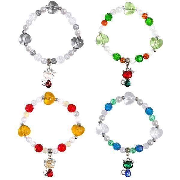 丸やハート型のビーズを使ったブレスレットにキラキラ光る猫ちゃんチャームがついたクリスタル感たっぷりなブレスレットです。【本体サイズ】:約W6×H8.5×D1cm(チャーム込)【素材】:【色・柄・種類】:8種アソート ※色・柄はご指定いただけません【個装形態】:50個で大きい袋入り【パッケージサイズ】:【名入れ可能サイズ】:【備考】:【最小ご注文数量】:270個以上270個単位