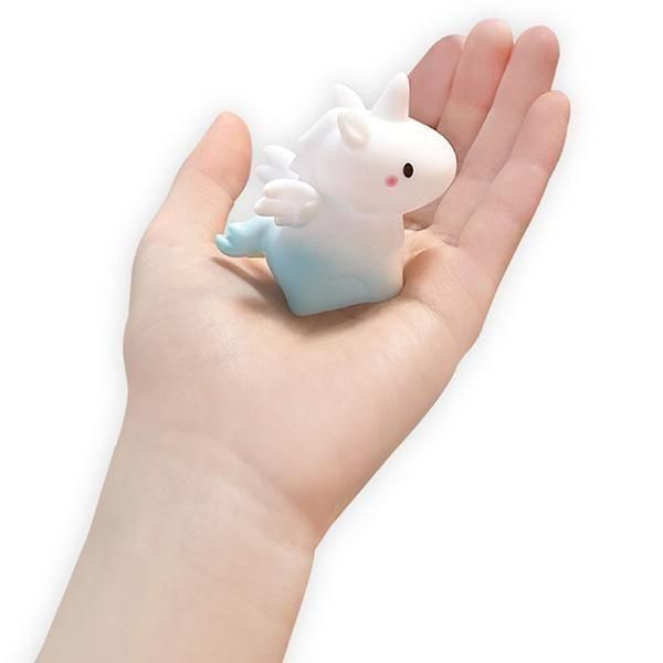 レインボーカラーのかわいいユニコーンのスクイーズです。水に浮かべることができ、指でボディをつまむとピーッ!と音がします。